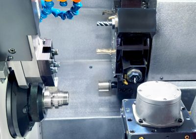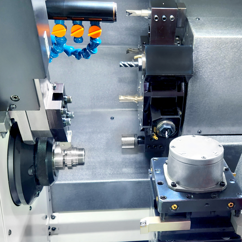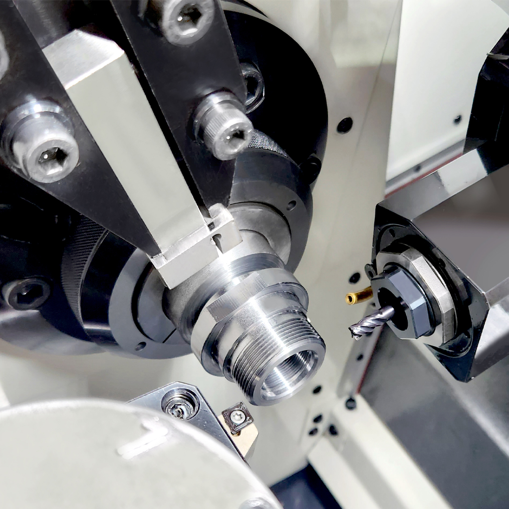 Die TBA NEXT verfügt über 6 CNC-Achsen, einen auf dem hinteren Kreuzschlitten montierten achtfach Revolver für angetriebene Werkzeuge, über einen kräftigen Form- und Stechschlitten und darüber hinaus über einen vierfach Revolver, der auf dem zweiten Kreuzschlitten montiert ist. In anderen Worten: Mehrschlittentechnik vom Feinsten